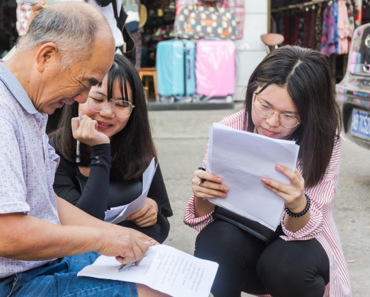清晨六点,本队伍集合出发,步行两公里到达目的地。每月的农历初三、初六、初九、十三、十六、十九都会有赶集者聚集在这里。当队伍到达时,赶集者比队伍还早到达这里,并已经开始了今天的工作。调研组在市集上寻找着在民间的传统手工艺者。一个用竹片编织的箩筐吸引了调研组的目光,组员们上前询问后,发现这种筐子是老人自己编制的,李老先生投身手工艺创作已经五十多年了。由于赶集的时间有限,调研组的队员们跟李老先生约定下午去老先生家里做个专访。