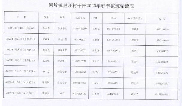 网岭镇里旺村干部2020年春节值班轮流表